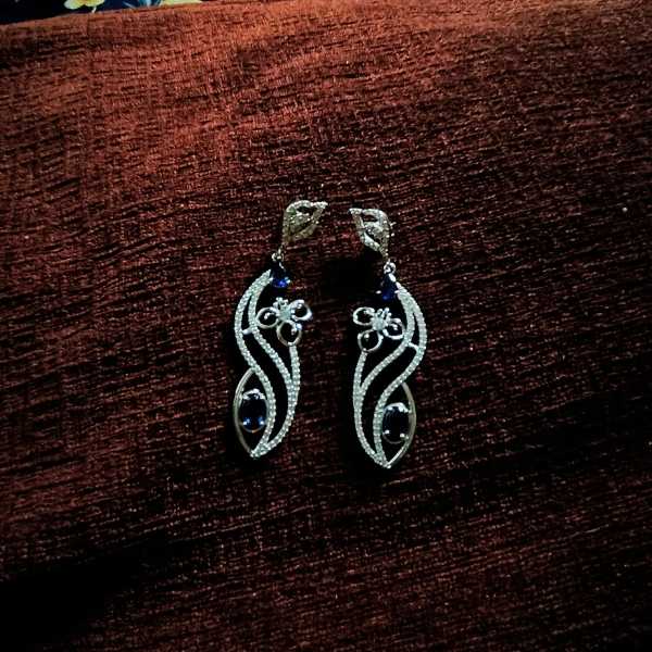 Unveil elegance with the Mystic Bloom Silver Drop Earrings, featuring deep blue gemstones set in flowing silver-toned metalwork. Each earring showcases a unique floral and leaf-inspired design, adorned with shimmering accents that make them perfect for weddings, festive occasions, or statement gifting.
