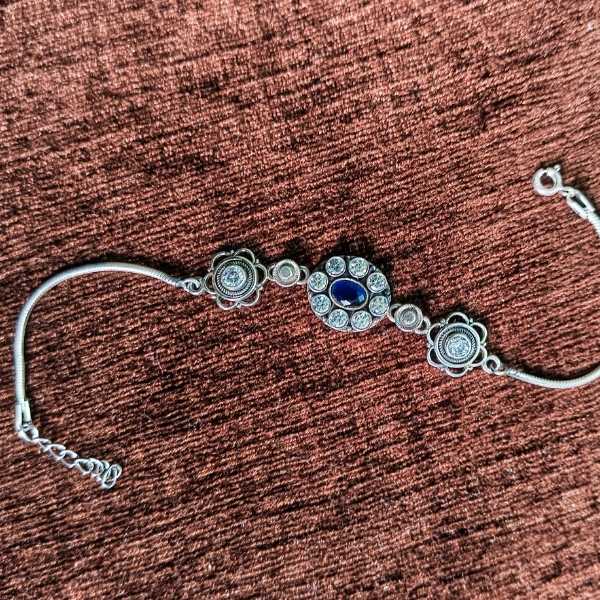 Embrace timeless elegance with the Midnight Bloom Gemstone Bracelet — a captivating blend of classic design and modern artistry. At its heart lies a deep blue gemstone encircled by shimmering clear stones, evoking the mystery of a moonlit sky. Flanked by symmetrical floral-inspired motifs, this bracelet radiates grace and charm. The metallic chain and secure clasp ensure both comfort and durability, making it ideal for festive occasions, evening wear, or as a thoughtful gift. A piece that speaks of beauty, balance, and brilliance.