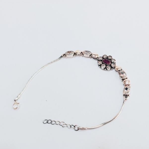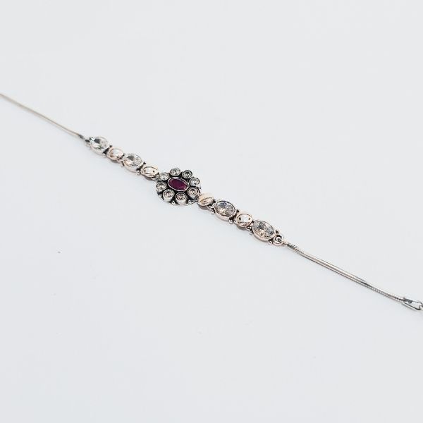 Grace your wrist with the timeless charm of the Ruby Radiance Silver Bracelet — a delicate fusion of vintage elegance and modern sparkle. The centerpiece features a rich red gemstone encircled by shimmering clear stones, flanked by symmetrical oval accents that enhance its regal appeal. Crafted in sleek silver with a fine chain finish, this bracelet is perfect for festive occasions, bridal wear, or everyday sophistication. A radiant choice for those who appreciate refined beauty and intricate design