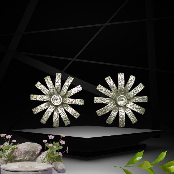 Radiating elegance, these sterling silver stud earrings feature a sunray-inspired floral design with delicately engraved petal spokes and a luminous central accent. A bold yet graceful piece for everyday and festive wear.
