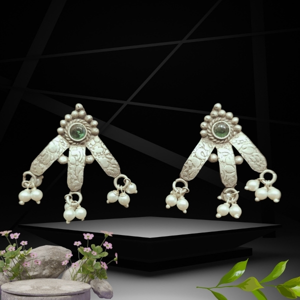Inspired by graceful pallavi drapes, these handcrafted sterling silver earrings feature etched petal panels accented with a luminous emerald center and delicate pearl danglers. A refined blend of tradition and elegance