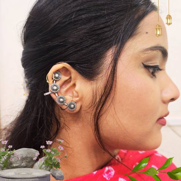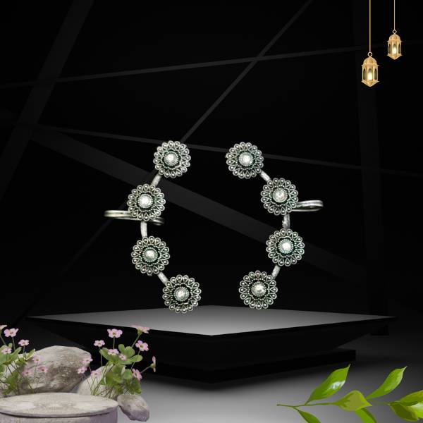 Elevate your style with the Eternal Bloom Sterling Silver Floral Cuff Bracelet. Crafted in pure 925 sterling silver, this elegant open cuff features intricate floral motifs adorned with shimmering stones, making it a perfect blend of tradition and modern sophistication. Ideal for festive wear, weddings, or everyday elegance.