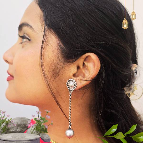 Handcrafted 925 sterling silver earrings featuring a classic paisley stud with a twisted chain drop and silver ball finish. Elegant, lightweight, and perfect for everyday or festive wear.
