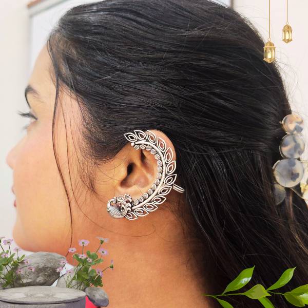 Handcrafted 925 sterling silver cuff bracelet featuring an elegant peacock motif with leaf-pattern detailing. Finished with an oxidized look, perfect for festive and everyday wear.