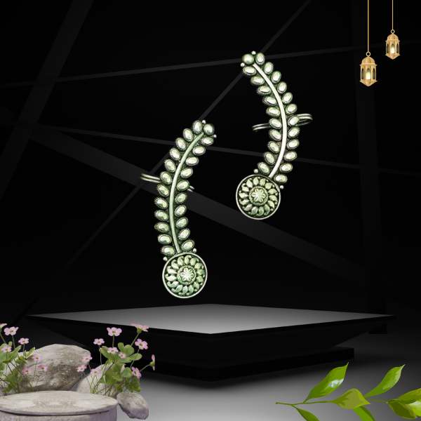 Sterling silver earrings crafted with a graceful leaf curve and delicate floral detailing. Elegant, lightweight, and nature inspired.Inspired by blooming florals and flowing leaves, these Floral Leaf Sterling Silver Earrings feature a curved silhouette adorned with fine leaf accents and a floral medallion at the base. Handcrafted in sterling silver, they bring a timeless ethnic-meets-modern charm—perfect for everyday wear or festive styling.