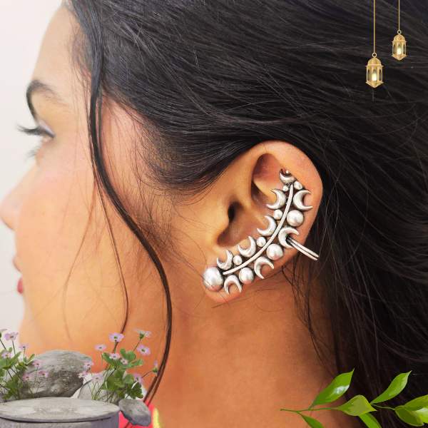 Elegant sterling silver ear cuffs with a flowing leaf-inspired design. Lightweight, contemporary, and effortlessly stylish.These Leaf Cuff Sterling Silver Earrings feature a graceful curved silhouette inspired by leaves and crescent accents. Handcrafted in sterling silver, they hug the ear beautifully, offering a modern yet nature-inspired look—perfect for statement everyday wear or festive styling.