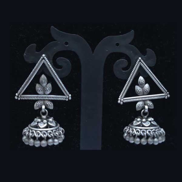Stylish 925 sterling silver jhumka earrings with triangle frame design, oxidized finish, and classic bead danglers for a bold ethnic look. Add a modern ethnic twist to your jewelry collection with Triangle Silver Jhumkas, crafted in 925 sterling silver with an antique oxidized finish. The unique triangle top with delicate floral detailing pairs beautifully with a traditional dome jhumka and hanging bead drops. Perfect for festive wear, weddings, and Indo-western styling.