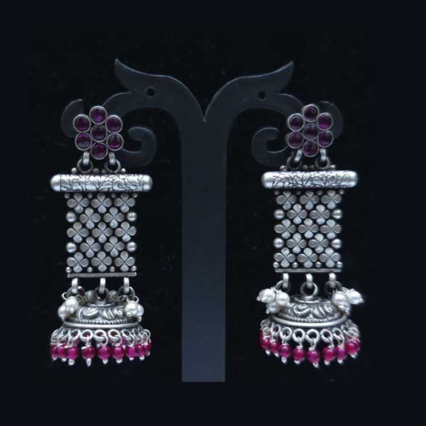 Statement 925 sterling silver long jhumka earrings with ruby floral stud, jali panel design, oxidized finish, and pink bead drops for festive ethnic style. Make a bold festive statement with Ruby Jali Silver Jhumkas, crafted in 925 sterling silver with an antique oxidized finish. The floral ruby-toned stud pairs beautifully with a textured jali panel and a classic dome jhumka. Finished with pearl detailing and bright pink bead drops, these earrings are perfect for weddings, parties, and traditional celebrations.