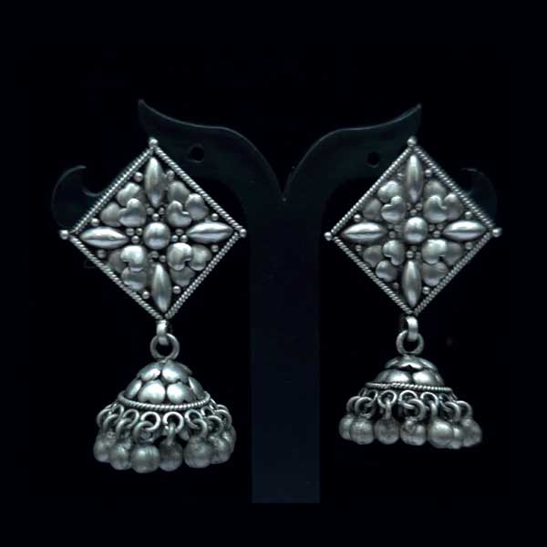 Diamond Floral Jhumki crafted in oxidised 925 sterling silver, featuring a diamond-shaped floral stud and a classic dome jhumka finished with ghungroo bead drops. A perfect match for ethnic and festive styling.