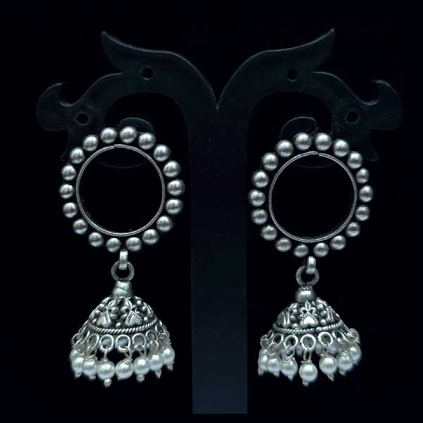 Elegant 925 sterling silver oxidised jhumki earrings featuring a stylish beaded hoop stud, traditional dome jhumka and delicate pearl drop hangings. Perfect for daily ethnic wear, festive outfits and gifting.