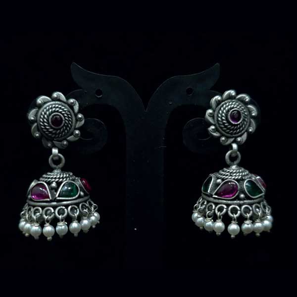 Beautiful 925 sterling silver oxidised jhumki earrings featuring a floral stud, ruby & emerald polki stones on the dome, and elegant pearl-style bead hangings—perfect for festive and traditional looks.