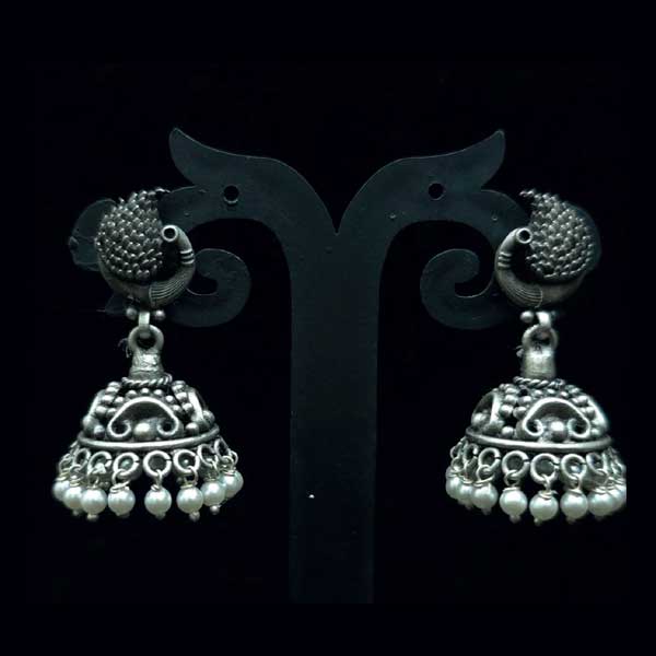 Elegant 925 sterling silver oxidised jhumki earrings featuring a detailed peacock stud, handcrafted dome design and pearl-style bead drops for a timeless ethnic look.