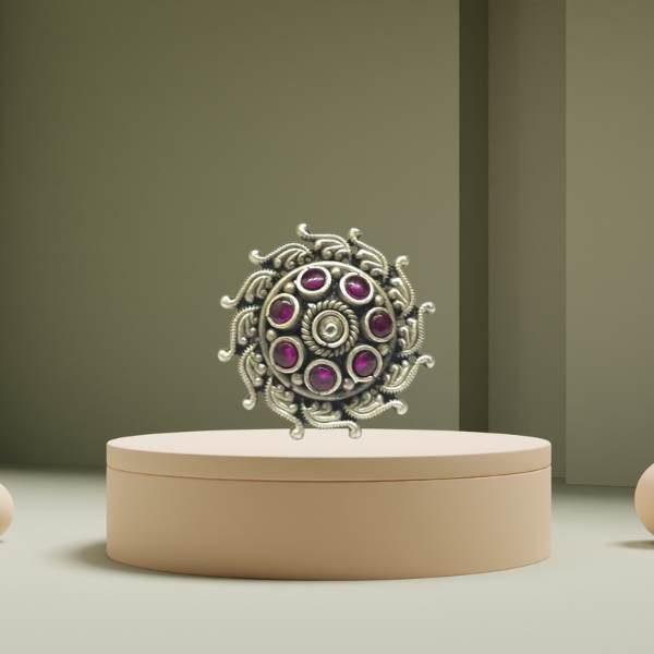 Handcrafted 925 sterling silver oxidised ring with a bold spiral floral design and rich ruby-colored stones, perfect for festive, ethnic, and statement styling.