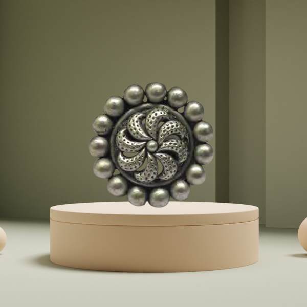 Beautiful 925 sterling silver oxidised ring with a spiral swirl centre and bold pearl-bead border, giving a classic tribal statement look.